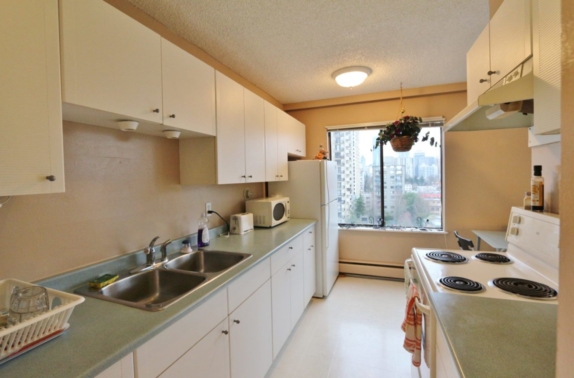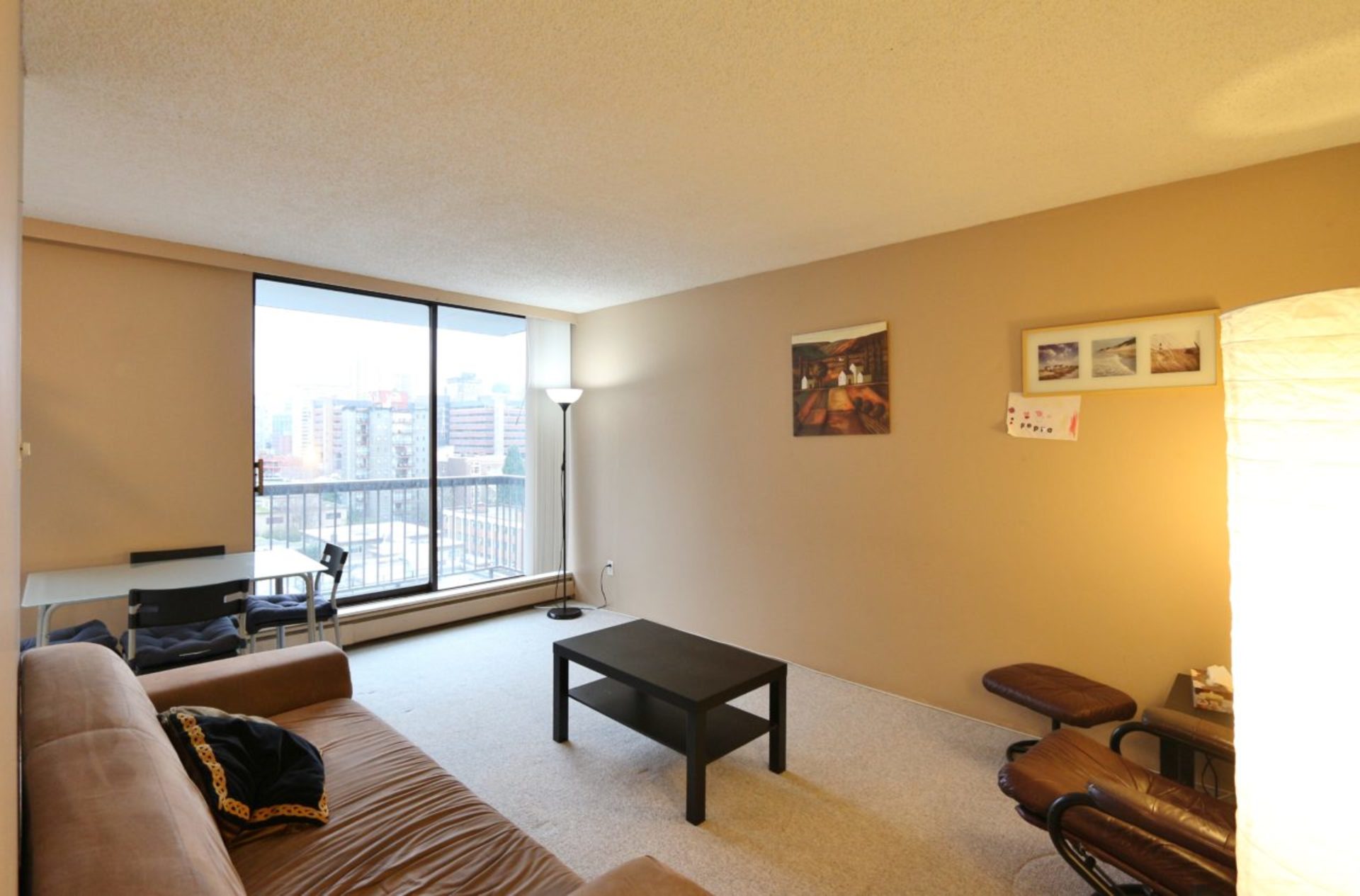 SUITE: Spacious 1-bedroom suite with beautiful city views in one of West End's best and most coveted concrete high-rises. Tons of natural light with a good-sized balcony, galley kitchen, huge living room with space for a dining room table next to the kitchen.