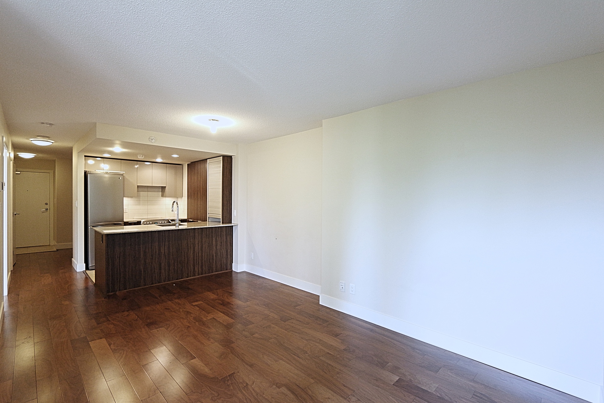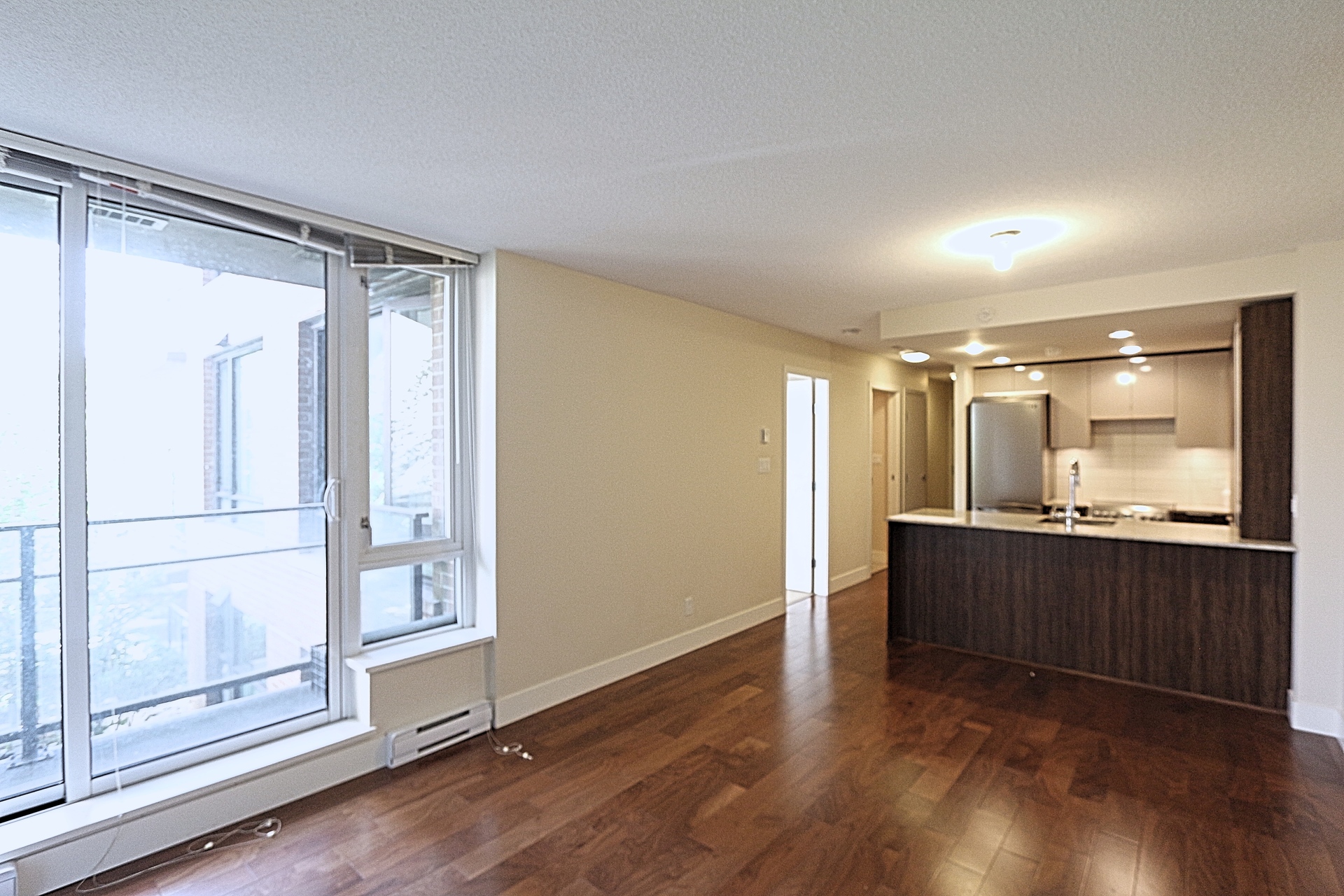 FEATURES: This beautiful 1 bedroom plus den condo offers, dark hardwood floors, open concept floor plan, large windows, In-suite laundry and storage, modern kitchen with gorgeous cabinetry, high-end granite counter top can double as a breakfast bar for quick meals and entertaining. The bedroom is well sized with large windows. There is a den big enough that can be used as a second bedroom or an office. There is 1 parking spot included as well as visitor parking for your guests.