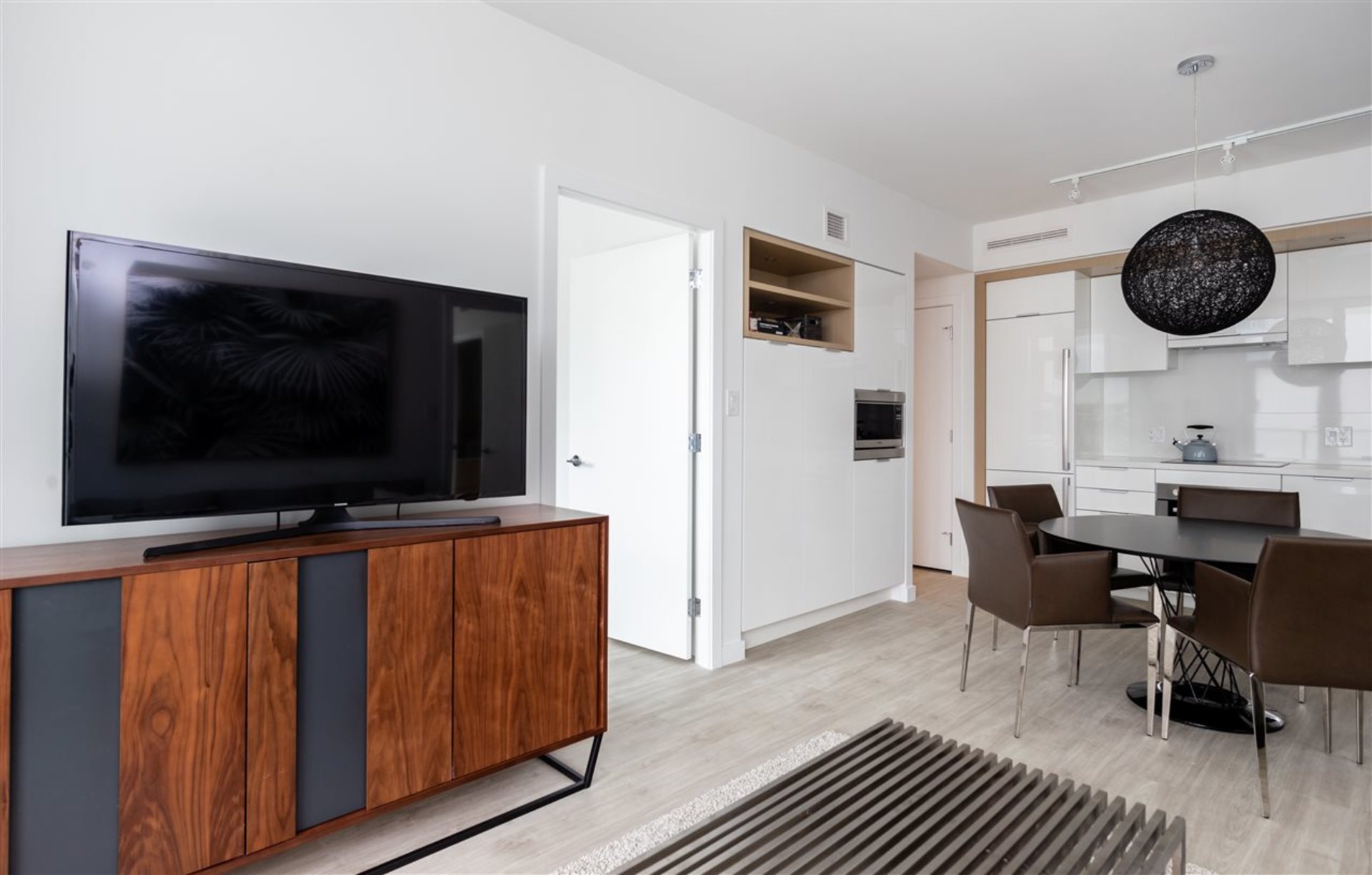 Open layout living & dining room with sleek European style kitchen that showcases integrated appliances. This luxury unit includes 2 spa-like ensuites, a deck showcasing your Southeast city outlook, central heating and A/C.