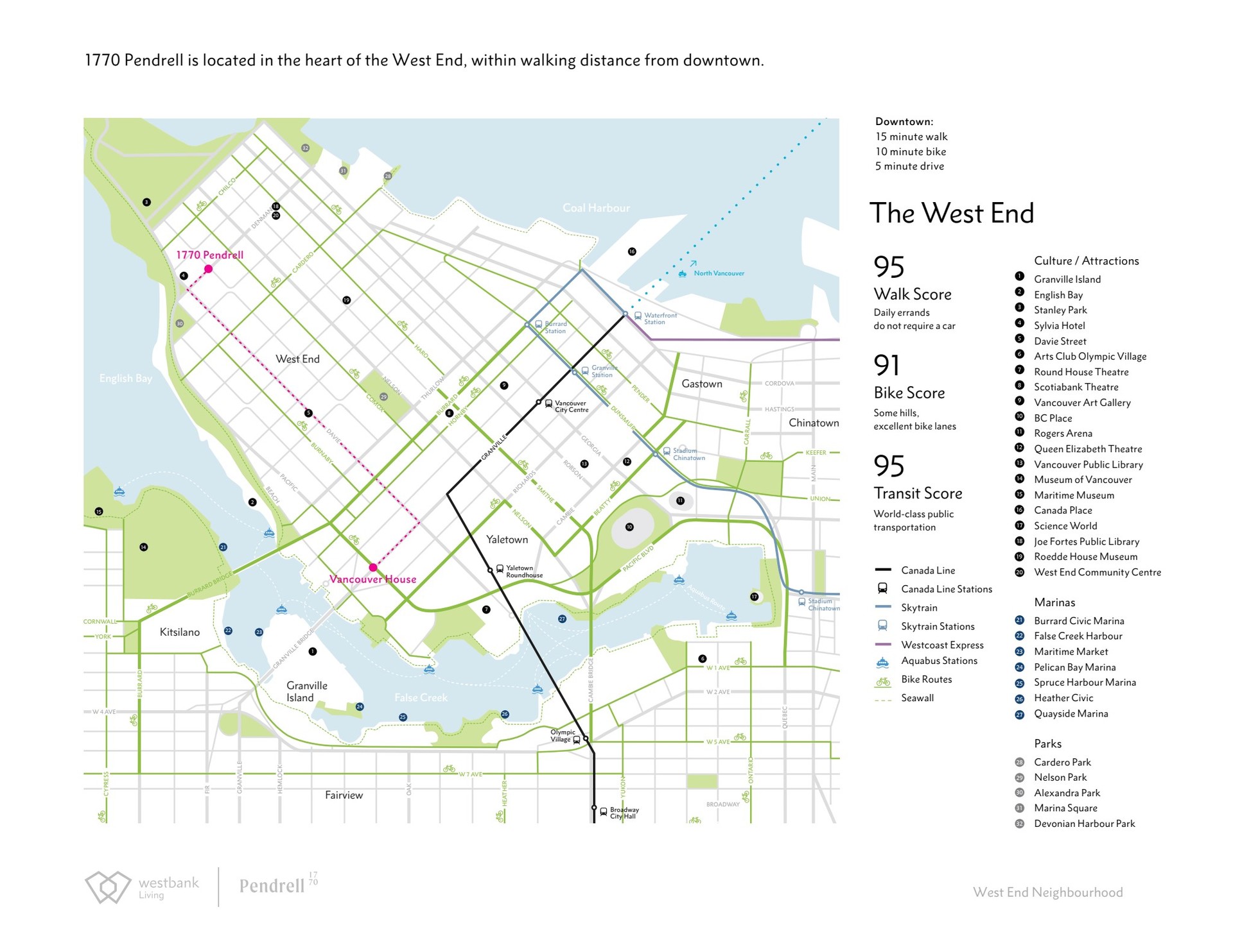1770 Pendrell was initially designed as a for sale residential project and is built to the same quality and level of finishing that has made our for sale residential among the most sought-after residences in the cities in which we work. All 173 homes are beautifully designed with artistry and an attention to detail that sets them apart from any rental home in our city. Pendrell also includes exceptional amenities including a gym, amenity kitchen and rooftop terrace offering panoramic views of English Bay. 1770 Pendrell is located in the heart of the West End, one of the most desirable neighbourhoods in the city. Located at the edge of English Bay, on the corner of Pendrell Street and Denman, residents will enjoy access to all of Downtown’s dining, entertainment, cultural institutions, shops and services and the stunning natural beauty of Stanley Park, English Bay as well as Sunset, 2nd and 3rd Beach.