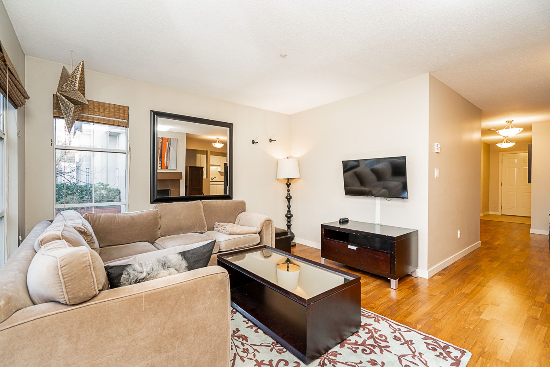 Spacious living room, eating nook off the kitchen, 2 full bathrooms, engineered hardwood floors, spacious master bedroom with ensuite. Full-size washer and dryer. The covered balcony will fit chairs, a table, and a barbecue grill. Near City Square Shopping Center, Whole Foods and Canadian Tire are just a few steps away.