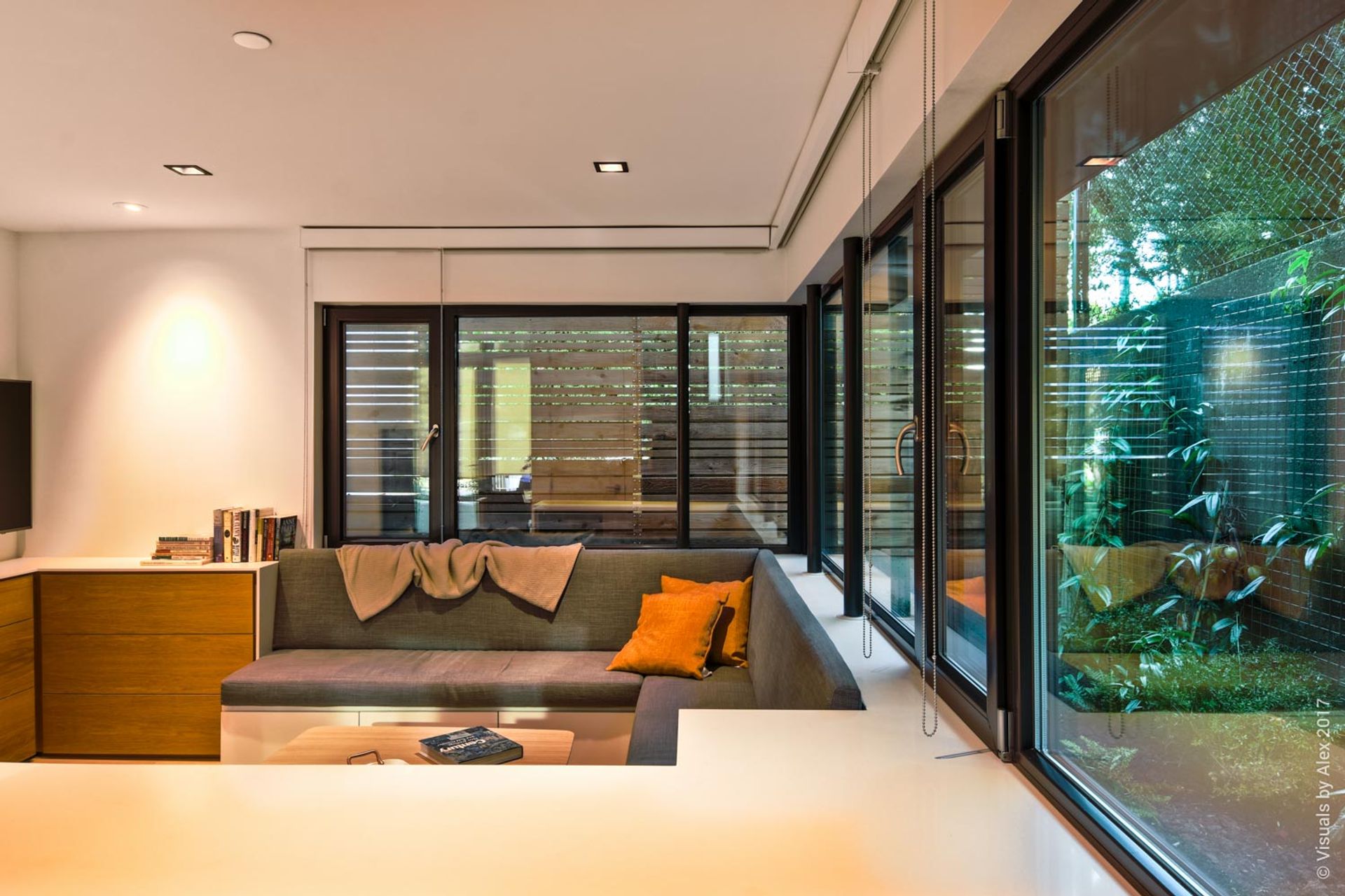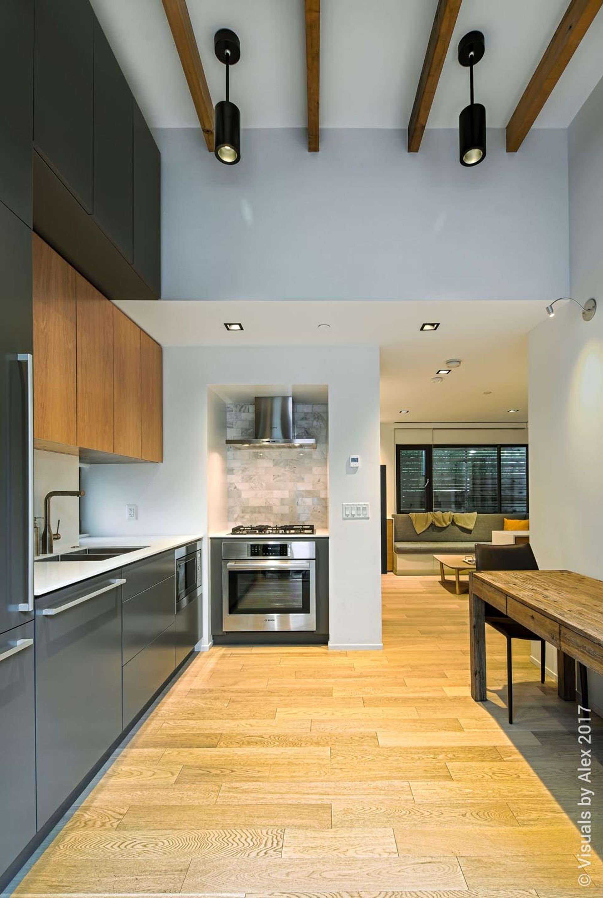 Private, two-level Kitsilano Vancouver furnished laneway home rental with high ceilings and hardwood flooring impresses with a unique design and beautiful furnishings featured in Modern Homes Magazine.